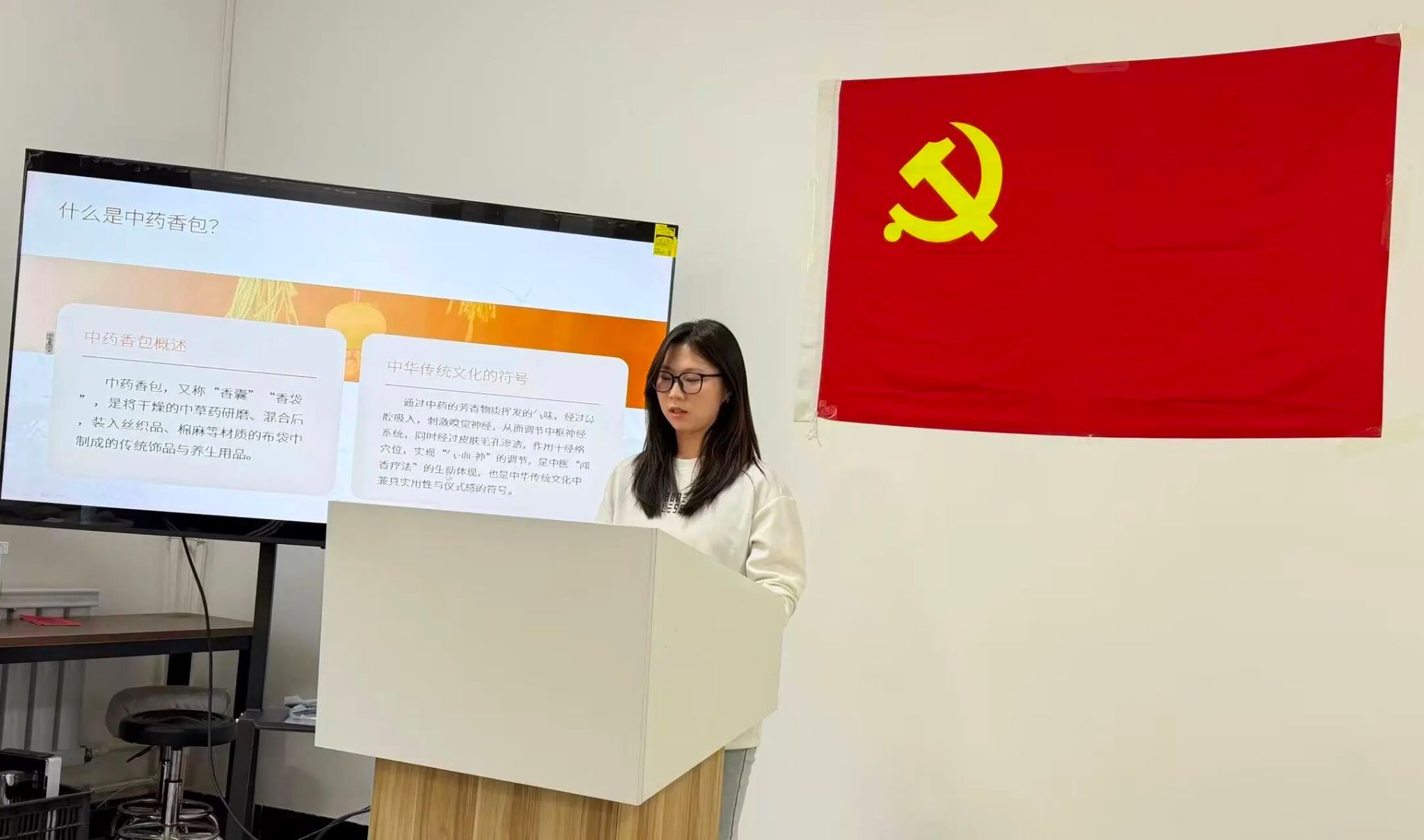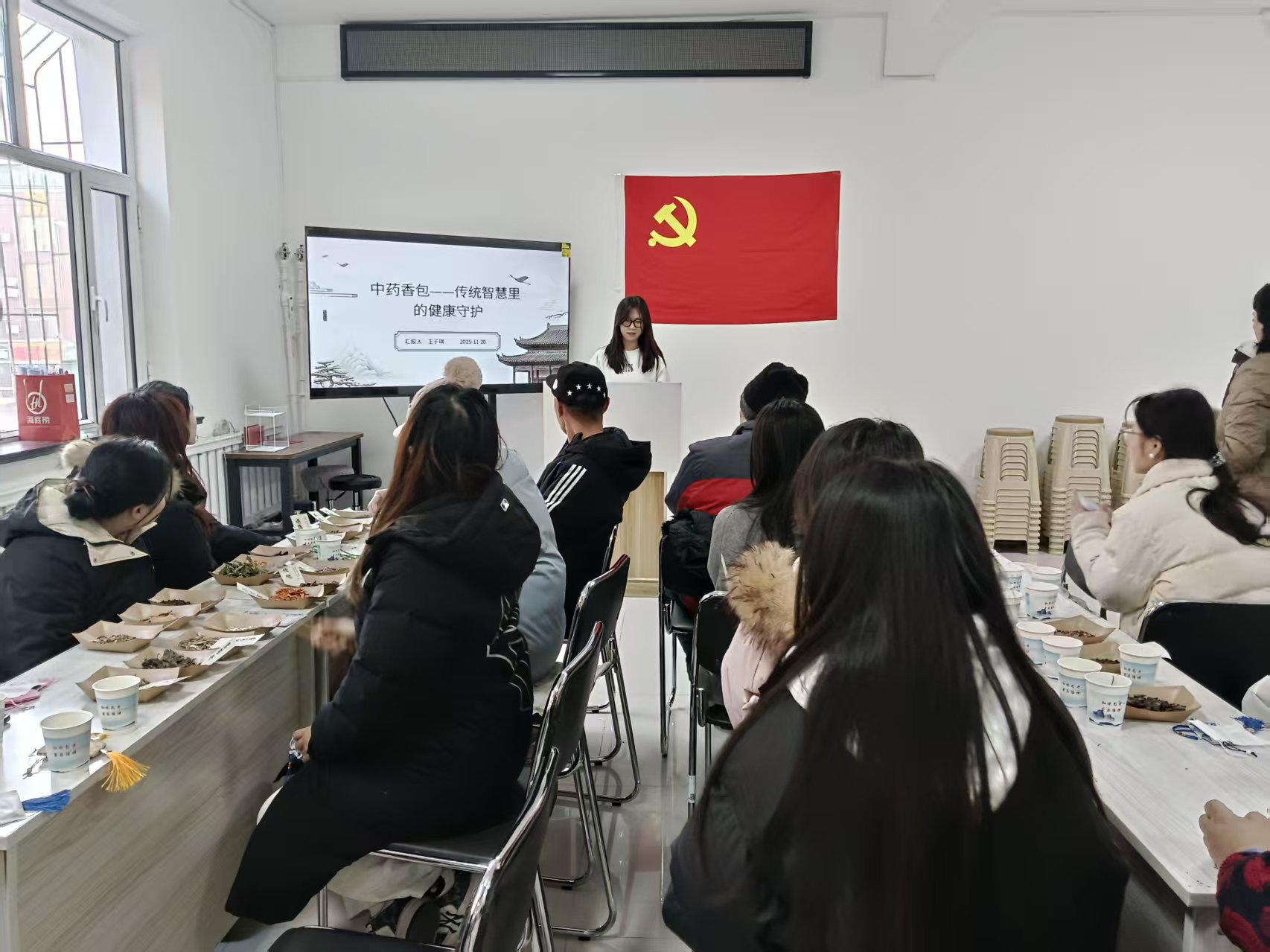 为传承中华优秀传统文化,发挥党建引领文化传承与健康养生融合的作用,11月20日,公司员工第二党支部走进老年社区,以中药香囊为纽带开展了主题党日活动暨志愿服务活动。支部成员王子琪通过PPT生动讲解传统养生智慧,其他员工党员现场帮扶指导,在药香与笑语中为社区老人们送去健康关怀。
