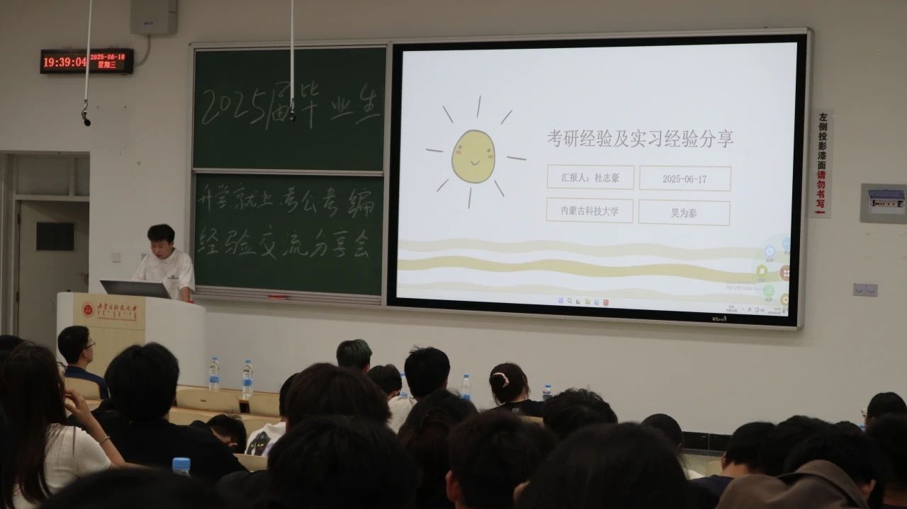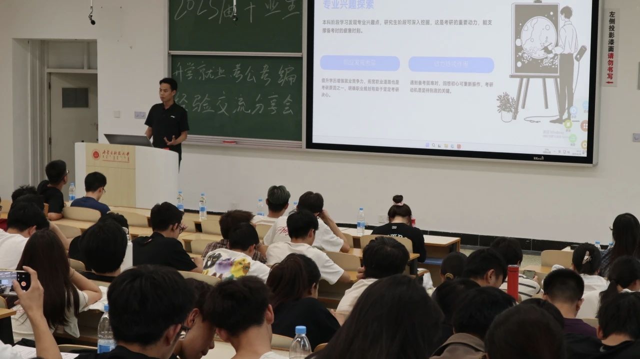 李荣将同学强调考研动机和院校选择的重要性,还分享了专业课复习经验。基础阶段全面阅读教材,理解知识点;强化阶段梳理重点知识,进行专题复习;冲刺阶段模拟考试,查漏补缺。毛尉然同学分享备考时间管理方法和调整心态应对考试压力的经验。他制定详细学习时间表,合理安排学习任务,保证学习效率。同时注重劳逸结合,每周安排休息和娱乐时间。万佳瑞同学从自身经历出发,讲述了考研过程中遇到的问题及解决办法。备考初期,他因学习进度慢而焦虑,后来通过调整学习方法,提高学习效率,逐渐跟上进度。还营造良好的学习和生活环境。