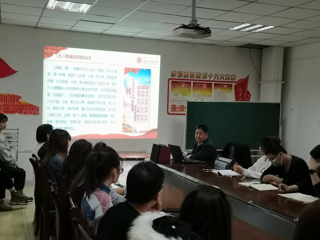 冯志强同志分别从制度治党的历史沿革、新时代从严治党基本要求以及深远意义三方面深入对制度治党进行了解读和阐释,并结合自身工作实际,从实践的角度强调了廉政建设的重要性。冯志强同志指出,制度治党事关长远,一定要做到标本兼治建章立制,完善全面从严治党,不断提高党的执政能力和领导水平。强调制度治党是推进中国特色社会主义制度更加成熟、更加定型的应有之义,是完善和发展中国特色社会主义制度推进国家治理体系和治理能力现代化的关键之举。同时强调,作为新时代青年,要旗帜鲜明讲政治、补足精神之钙、贯彻新时代的组织路线、念好作风建设“紧箍咒”,做到对党忠诚、为党分忧、为党尽职、为民造福,以时不我待、只争朝夕、敢为人先的革命精神和创新精神认真学习、深入研究,做时代的劲草和真金。