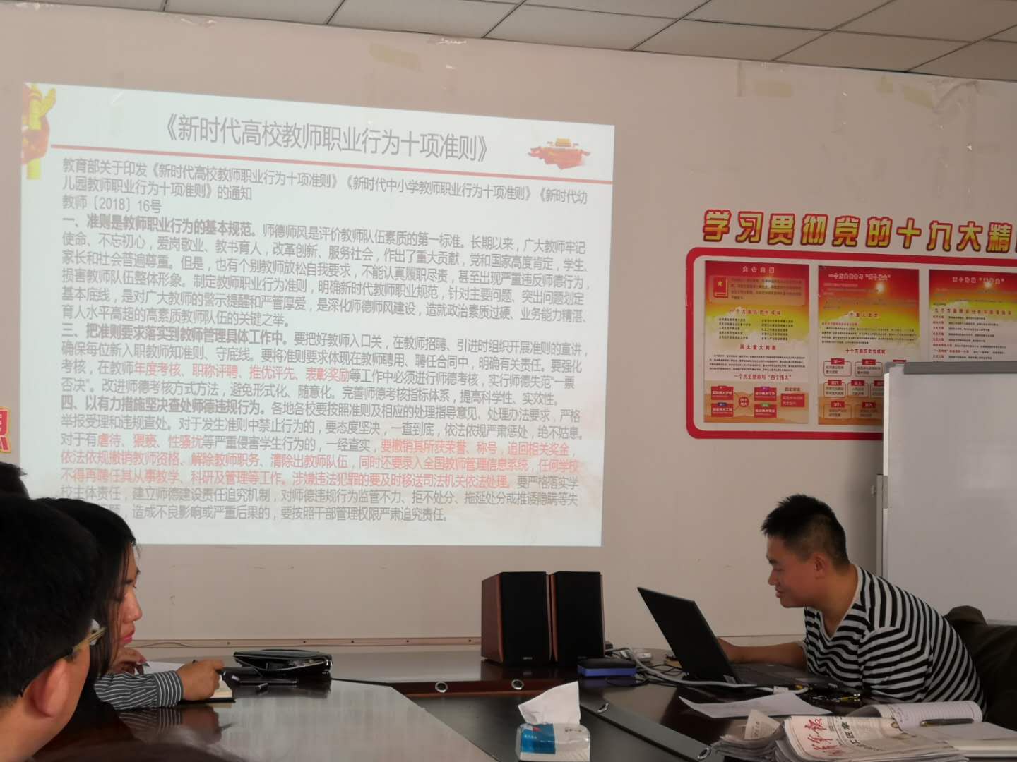 3月21日,公司开展师德师风建设专题教育活动,组织全体教工进行了习近平总书记在公司思想政治理论课教师座谈会上的重要讲话精神、《<教育部关于建立健全高校师德建设长效机制的意见>(教师﹝2014﹞10 号)中有关高校教师师德禁行行为“红七条”规定》和《新时代高校教师职业行为十项准则》等内容的专题学习。