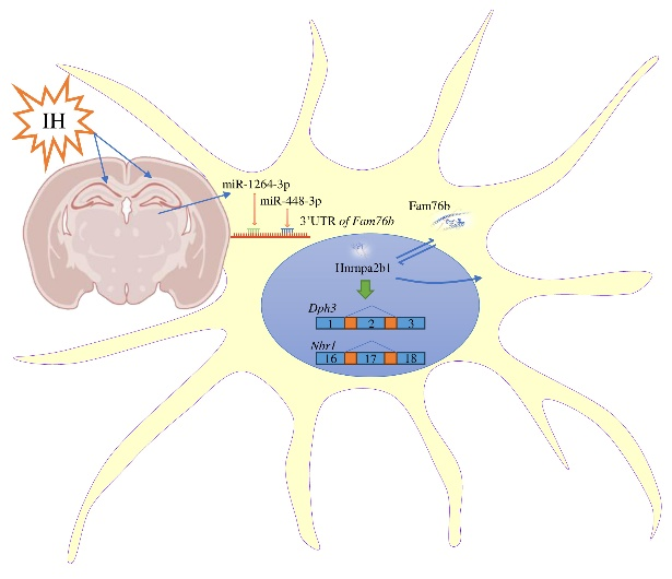 研究发现,间歇性低氧可导致小鼠海马区miR-448-3p和miR-1264-3p表达下调,并共同靶向调控Fam76b基因。Fam76b进一步影响剪接因子hnRNPA2B1的核质定位,从而调控下游基因Nbr1和Dph3的可变剪接。该通路在神经退行性疾病如阿尔茨海默病中可能发挥重要作用。